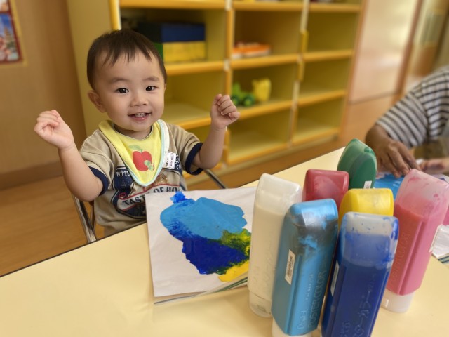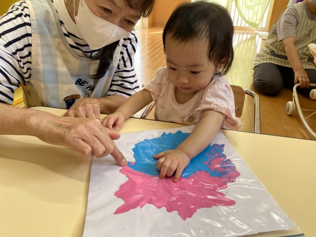 絵の具に直接触れるのがまだ難しい子も、安心して色の変化や動きを楽しむことができ、小さな指先や手のひらから色々な表現が飛び出していきました。