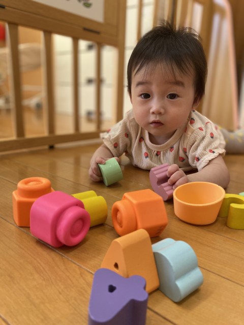 カラフルな玩具も大好きです。好きな色の物に手を伸ばしたり、色の違いに気付いて「これとこれ、ちがう」と不思議に思ったり、カラフルな物に誘われて「遊んでみたい!」という意欲が広がったり…。