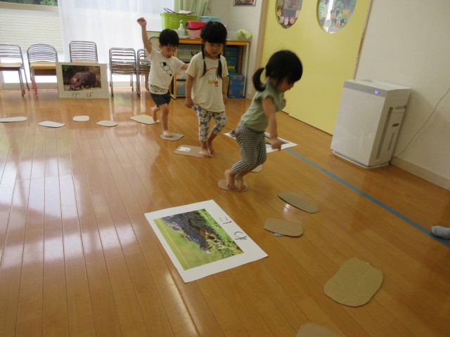 その後は、飛び石から落ちないように渡れるかみんなでチャレンジしました。