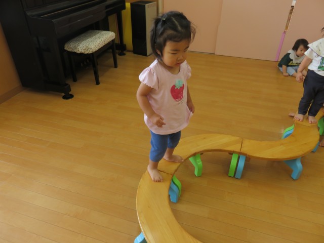 最初は慎重に両足ずつ乗せて渡る子が多かったのですが、慣れてくると片足のみ乗せて渡ってみたり、ジャンプをして渡ってみたり…。