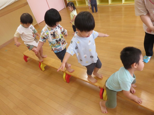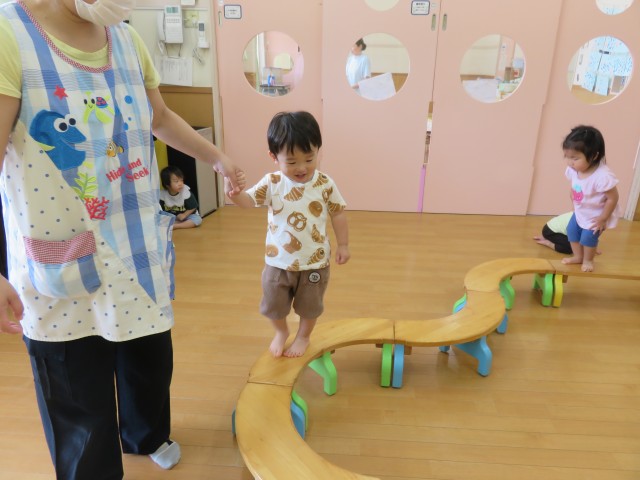 平均台では、はじめは保育士と手を繋いでバランスをとりながら出発です!!