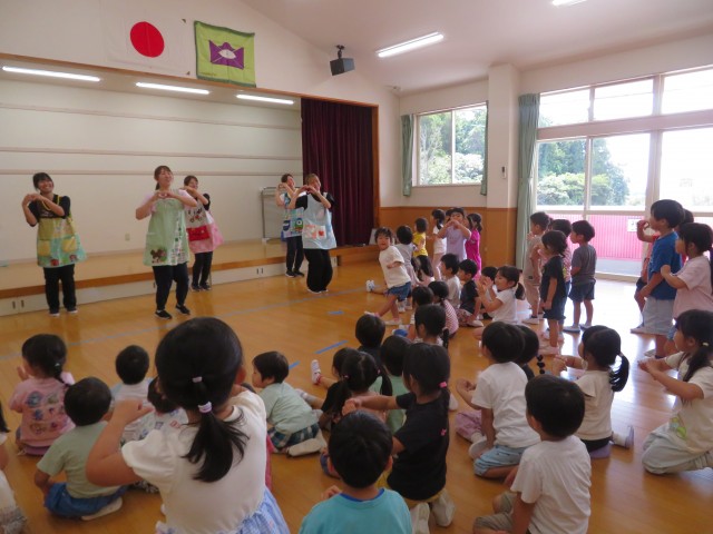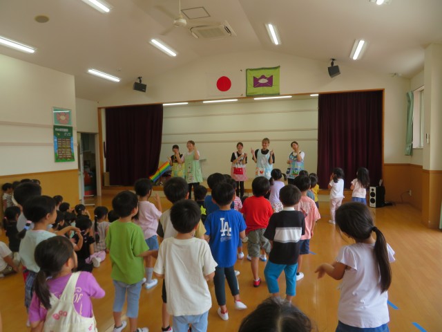 お楽しみは、先生たちによるミニ運動会!!先生たちの競技(特技!)やダンスを行いました。