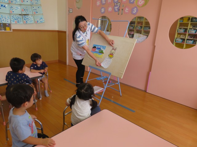 「うさぎさん!」「ぴょんぴょん!」と思い思いに言葉にする子どもたちです。