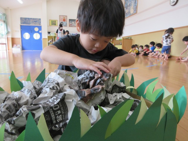 「どこにいるかな?」と草むらをかき分け、見つけられると「いたよ!」とお友達や保育士に嬉しそうに教えてくれました。