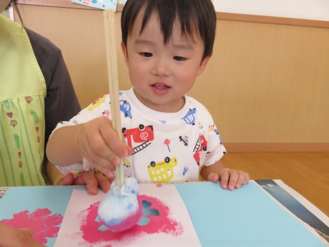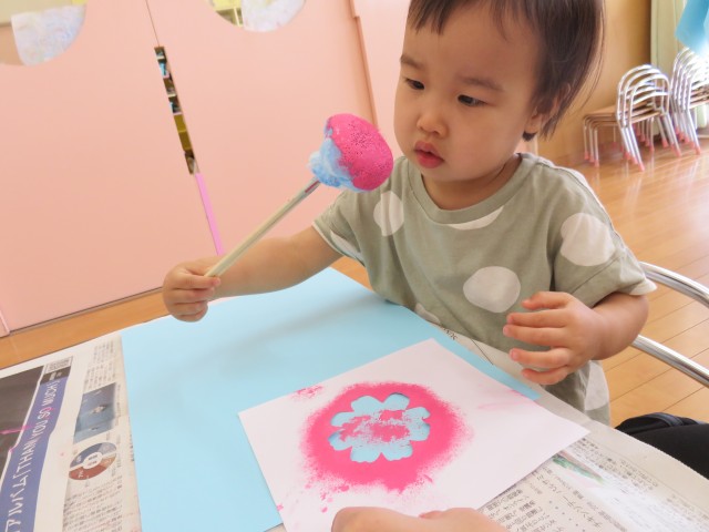 タンポ筆の使い方や、色が付いた時の表情、反応はそれぞれ!