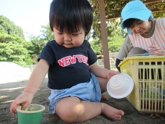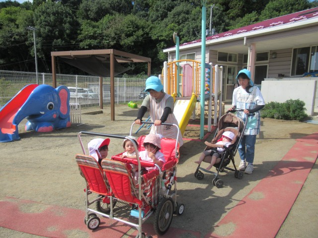 散歩車に乗って、大きいクラスの運動会の予行練習を見たり、砂場で砂遊びを楽しんだりしました。