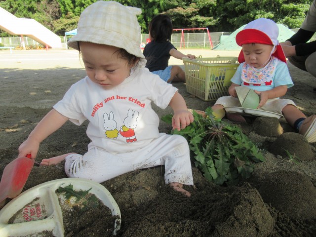 型抜きを作ると、手で壊して楽しんだり、たんぽぽの葉っぱをカップケーキに乗せて楽しんだりする姿が見られました!