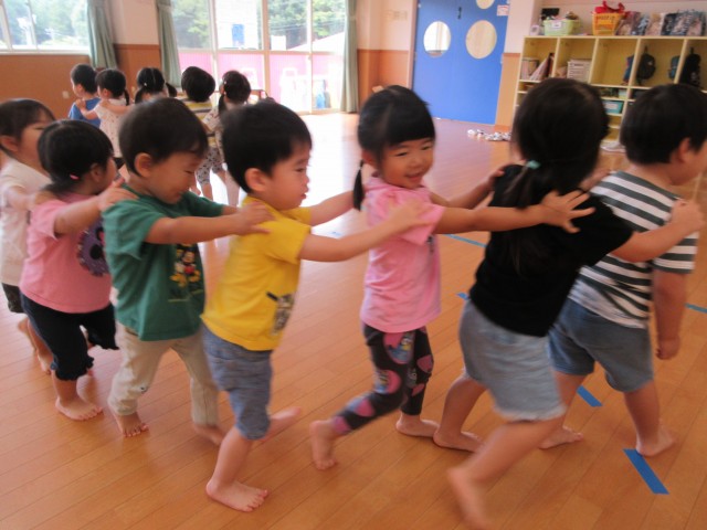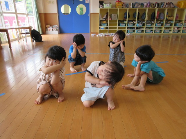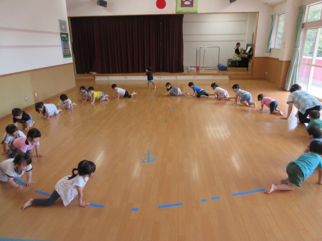 ピアノの音に合わせてジャンプ・お父さん歩き・おじいさん歩き・赤ちゃん歩き・ハイハイをしました。