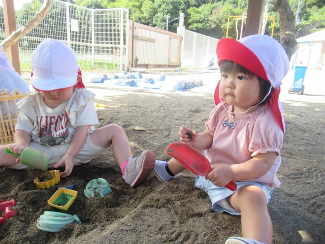 園庭をのんびりお散歩していると、つくし組さんが「いっしょにあそぼ~!」と砂場に誘ってくれました。