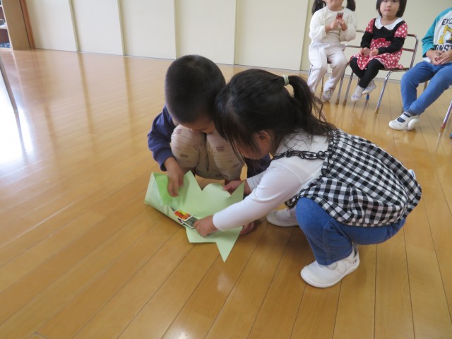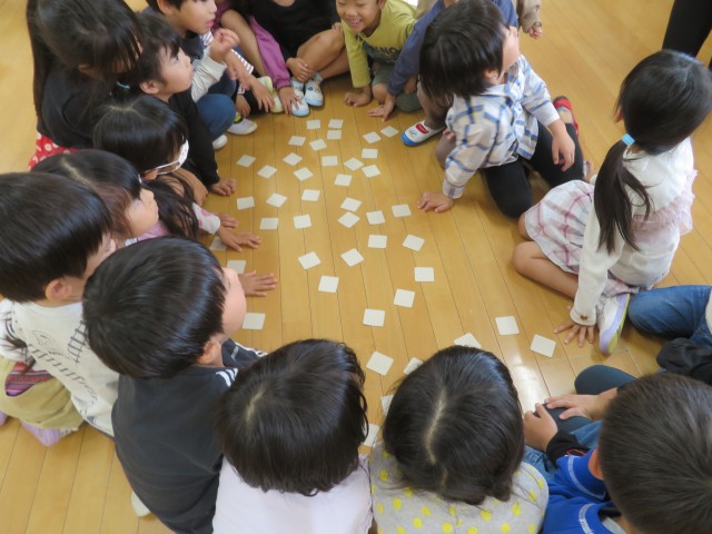 絵カードを使い、虫を探すゲームも楽しみました。うめ組、たんぽぽ組は沢山の絵カードの中から指定された虫を探します。見つけると「やったー!」と嬉しそうでした。