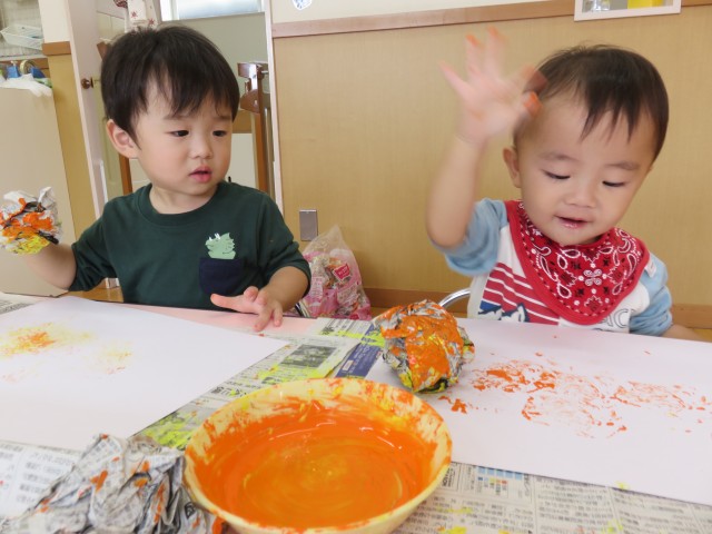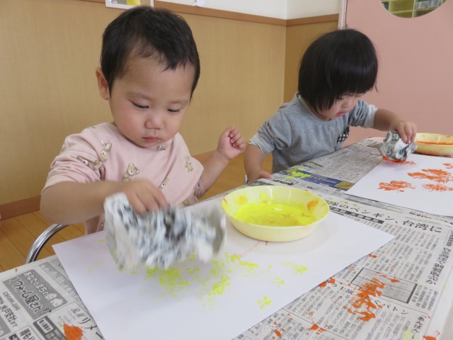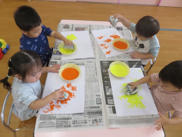 もみ紙スタンプをしました。今日は4人ずつ順番に行いました。名前を呼ばれると『は~い』と元気な返事をしていた子もいました。