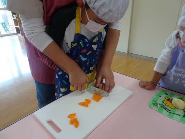 包丁やピーラーの使い方を確認しながら行い、「おいしくできるかな?」「はやくたべたいな!」とクッキングを楽しんでいた子どもたちでした。