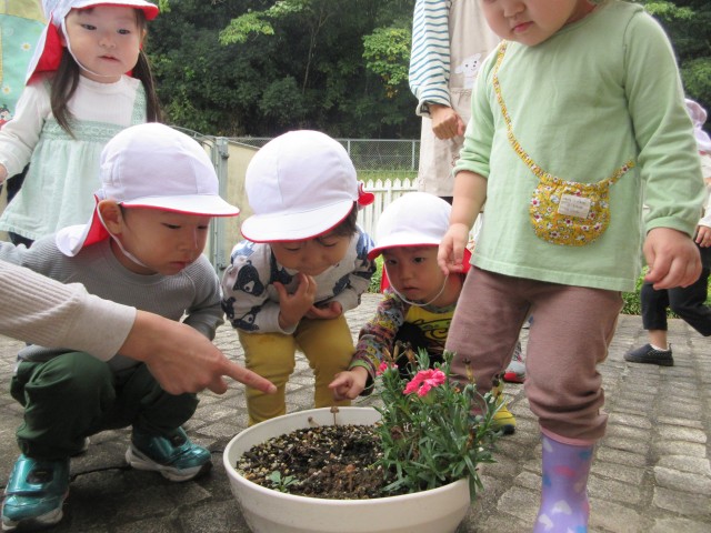 「せんせーちょうちょいたよ!」と教えてくれたので見に行くと、地面に花びらが落ちていました。