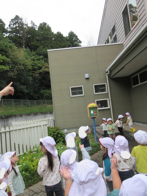 保育士の声掛けで上を見ると、つくし組保育室を見つけました。「あっ!」と保育室を指差したり、「きのこあったね~」と話をしながら見ていました。
