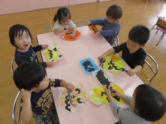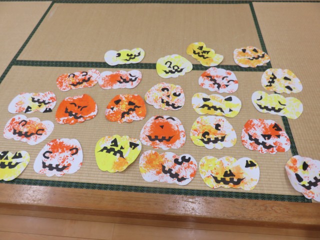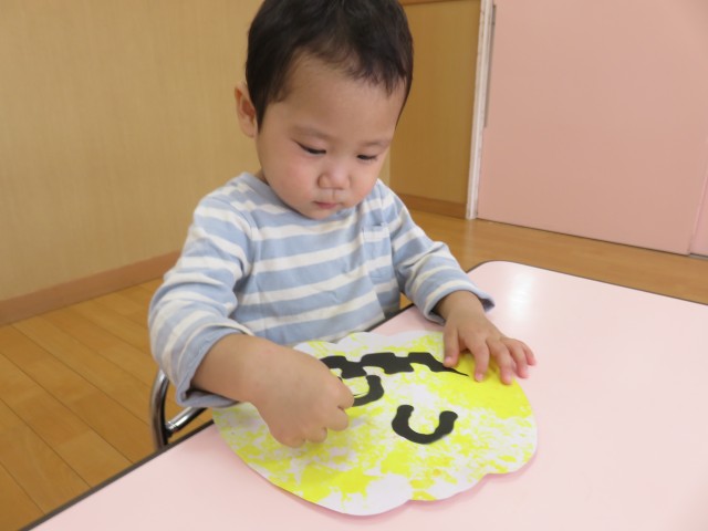 昨日もみ紙スタンプしたカボチャの台紙に目、鼻、口等のパーツ貼りをしました。どのパーツにしようか迷いながらも選んでいる姿が可愛らしかったです。