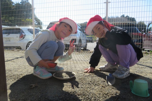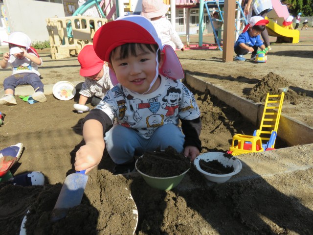 砂場ではお店屋さんごっこや工事ごっこで大賑わいでした。