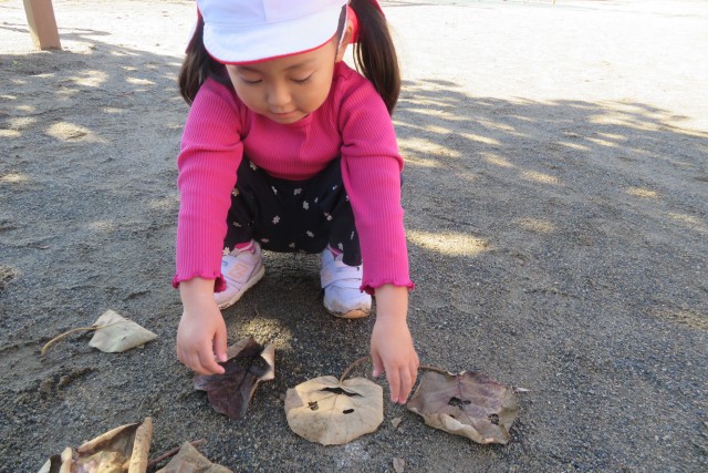 砂場の近くでキウイフルーツの木から落ちた枯れ葉を発見したお友達。