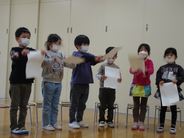 ピアノの音に合わせて「しぶちゃん! にぶちゃん!」と紙を叩いたり、手をグーにして打ったりして、音の強弱やテンポの違いを感じとりながら表現していました。