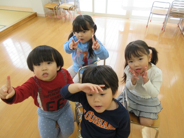ピアノの音が止まると「あっ」と言い、あいている椅子に座っていました。お友達に「ここあいてるよ!」と教える場面も見られました。