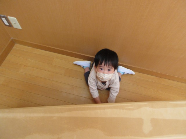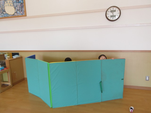 保育士が探しているのをそ~っとマットの後ろから顔を出していました…