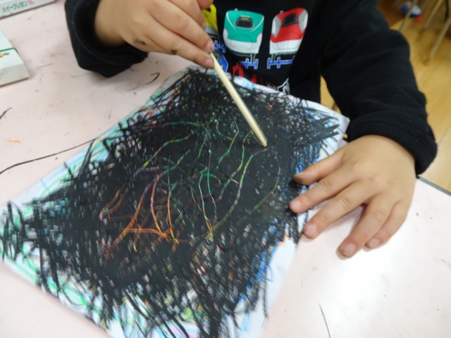 最後に黒のクレヨンで全体を塗り、削ると下の色が浮かび上がる仕組みを楽しみ、自分で生み出した色の変化に喜びを感じる子どもたちでした。