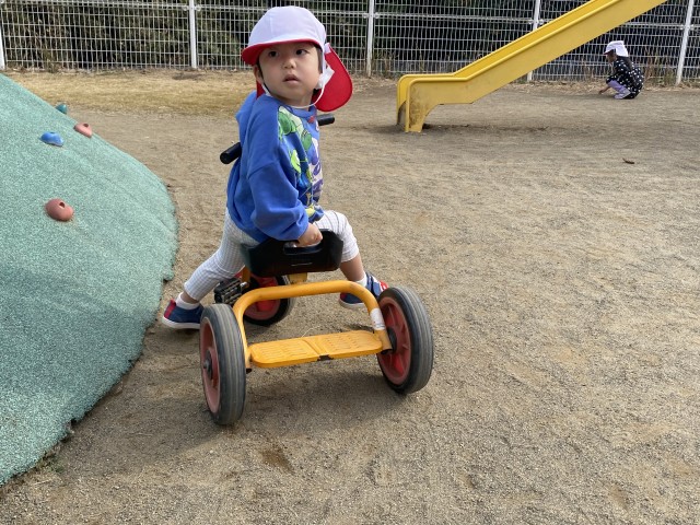 三輪車にまたがって地面を蹴って進んだり、自分の力でペダルを踏もうとしたり、中には二輪車に挑む姿も見られました。体の使い方がだんだん上手になってきて、バランスをとる力も育ってきています。