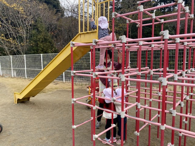 ジャングルジムでは、手でしっかり握り、足をどの段に置くか考えながら挑戦。自分で高さを確かめて登りながら、“こうやったら行けそう!”と判断する姿が見られました。