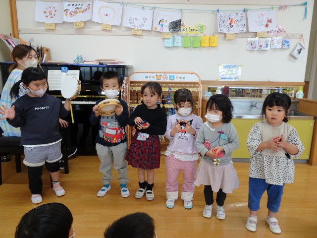 リズムが少しずつ体になじんできて、ピアノの音に合わせて楽しんで楽器を鳴らす姿が見られました。
