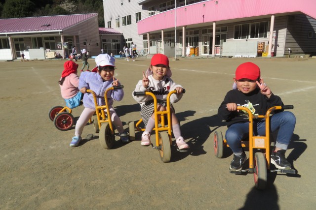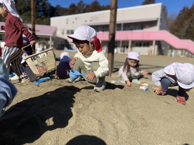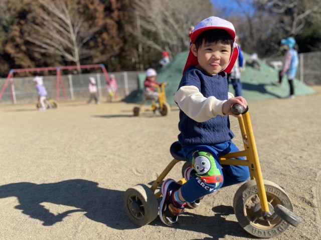 園庭では、砂場で感触を楽しみながら山を作ったり、三輪車に乗って心地良さを味わったり、ジャングルジムに登ったりと、それぞれの遊びを楽しんでいました。