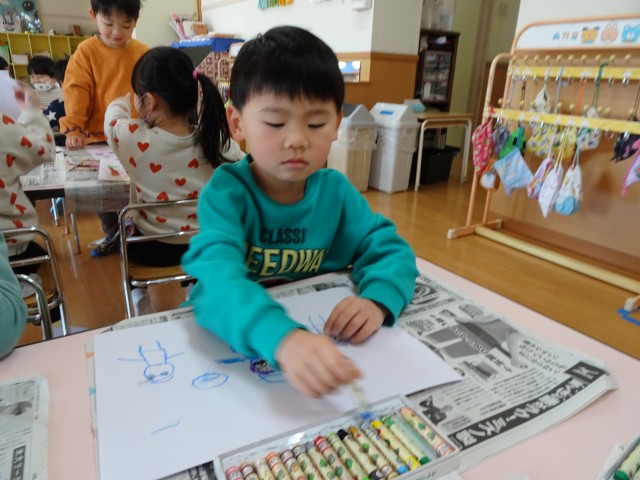 「忍たま乱太郎の劇遊び」をテーマにクレヨン画をしました。