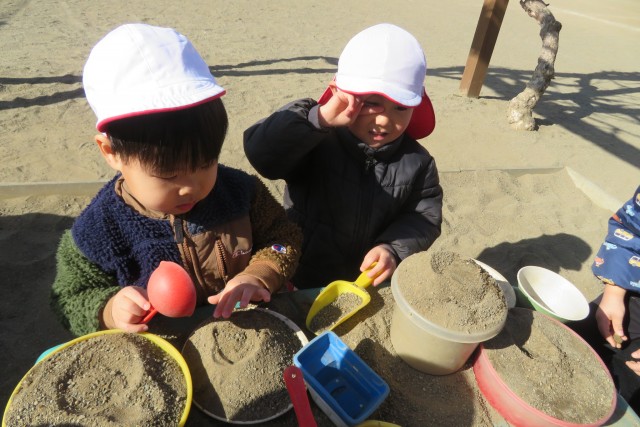 砂場で遊ぶ子は自分で玩具を持ってきて遊んでいました!