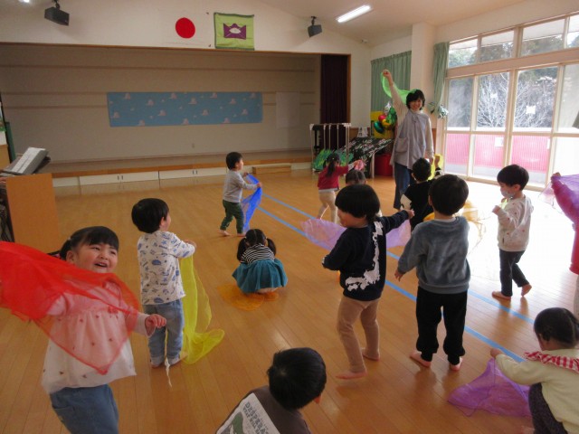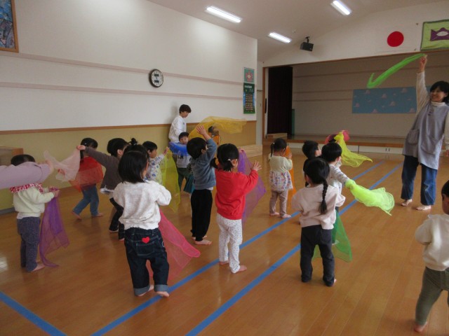 リトミックスカーフやフープを使って、音楽に合わせて体を動かして遊びました。