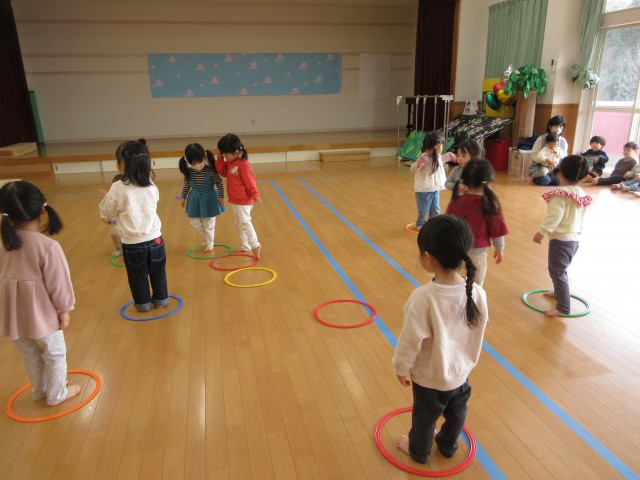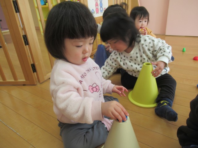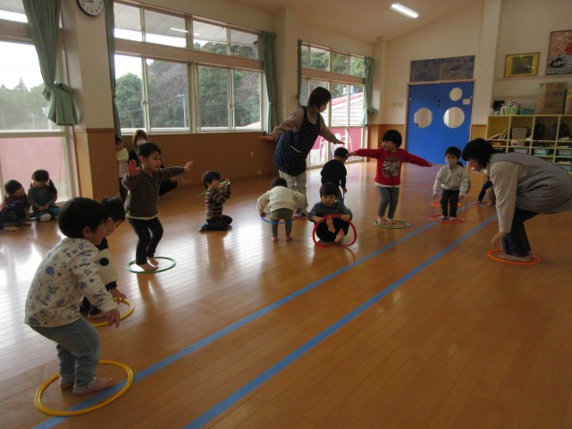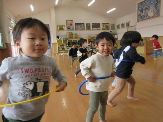 他にも、フープの中に入ったり、思い思いの動きを楽しむ姿が見られました。音が止まると動きを止めてみたり、保育士の真似をして体を動かしたりと、リズムを感じながら楽しんでいました♪