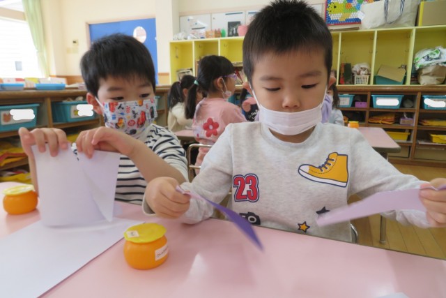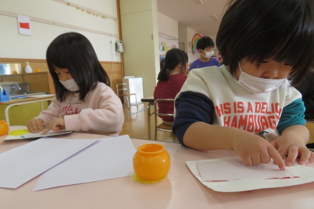眉毛や目や口をのりで貼りました。「鬼さんだから怖い顔にする!」「泣き虫鬼さんもいるよね~」と友達同士の会話を楽しみながら進めていました。明日、製作の続きをし完成させる予定です!