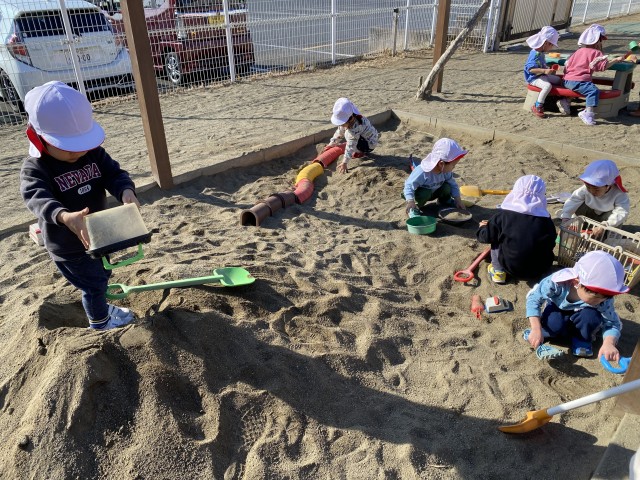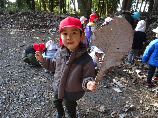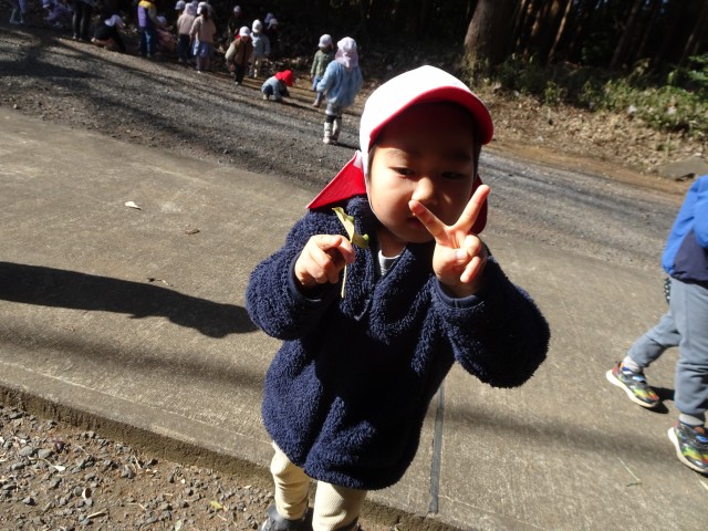 落ち葉や木の実を見つけては「あった!」「これ見て!」と嬉しそうに声を上げ、発見したことや感じたことを友達や保育士に伝えながら楽しんでいました。