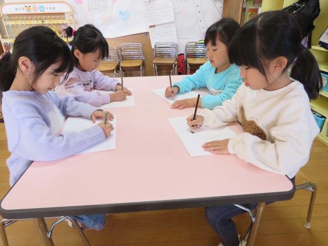 鏡を見たり、目や鼻の位置・形を手でそっと触って確かめたりしながら「ここかな?」「これくらいかな?」と考えながら丁寧に描き進める姿が見られました。