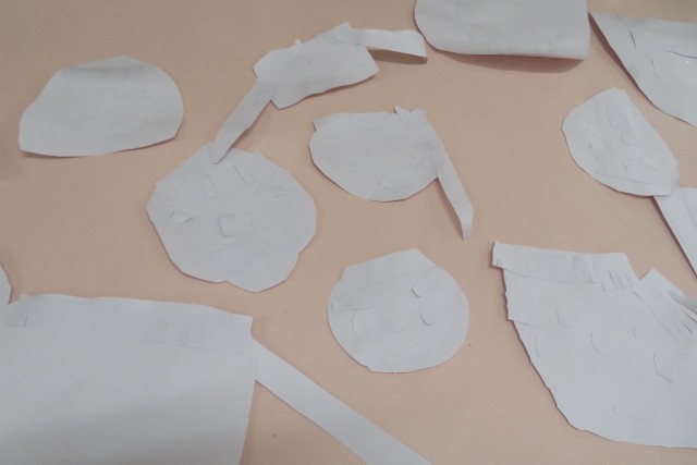 画用紙をはさみで切って、自分の顔のパーツを作り、のりで貼っていきました。