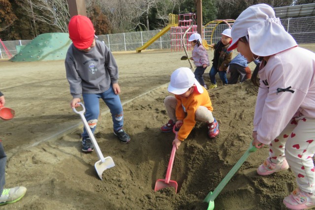 大きなシャベルを使い皆で力を合わせて穴を掘ります。