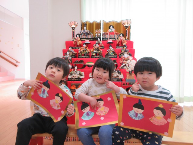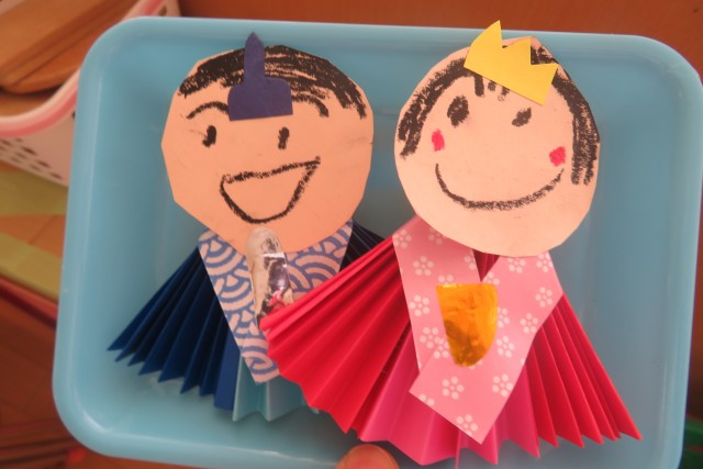 昨日作ったひな人形に、扇や冠、尺やえぼしを貼り、完成させました。出来上がったお雛様を見て、「はやくパパとママに見てほしい!!」とワクワクしていました。