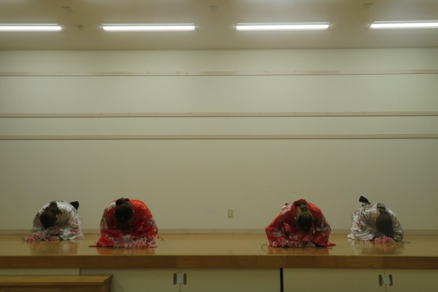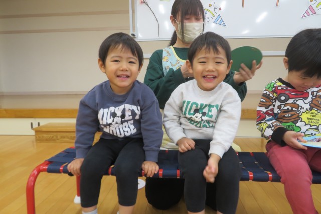 曲が流れると着物を着た保育士が登場。初めは”ポカン”とした表情をしていましたが、踊り始めると歌を口ずさんだり、振りを真似たり楽しむ姿が見られました!