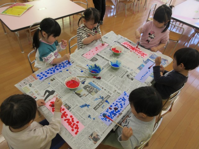タンポ筆を使ってポンポンと模様をつけます。それぞれ好きな色を選んで、絵本にでてくるイチゴやブルーベリーの山をイメージして作り進めました。