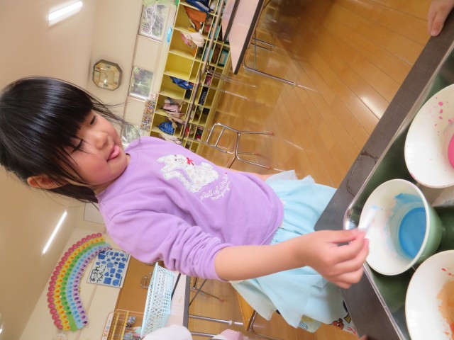 「何色にしようかな?」「青と赤にしたら紫になるかな!?」と色の混ざり合いも楽しんでいました。
