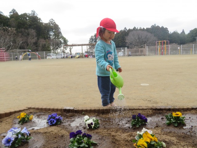 花壇のパンジーにお水をあげている姿です!