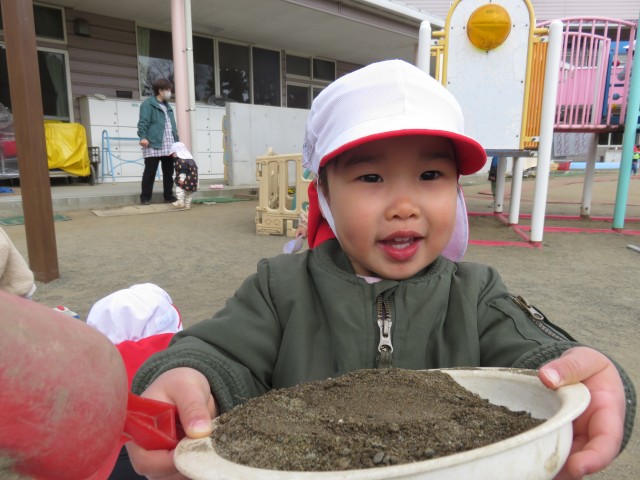 砂場で作ったお料理をごちそうしてくれた子どもたちでした。