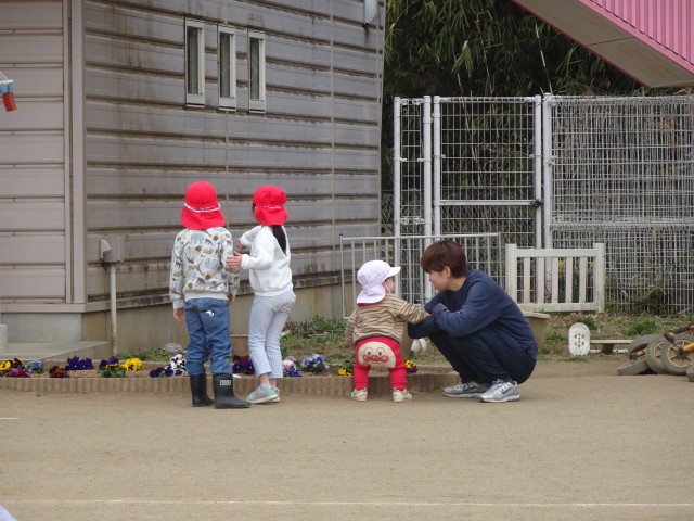 「パンジーのお花、きれいだね」と花壇ではひよこ組のお友達に優しく声を掛けている姿も見られました。