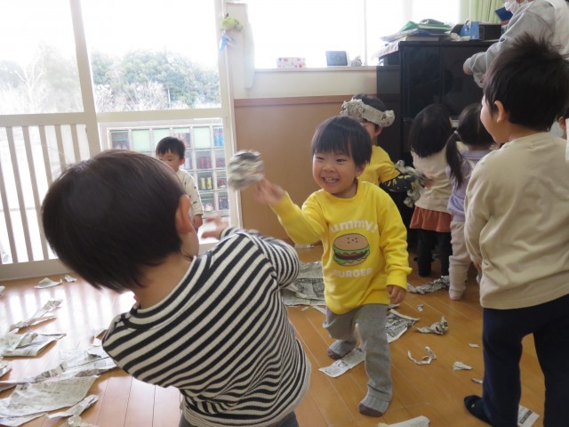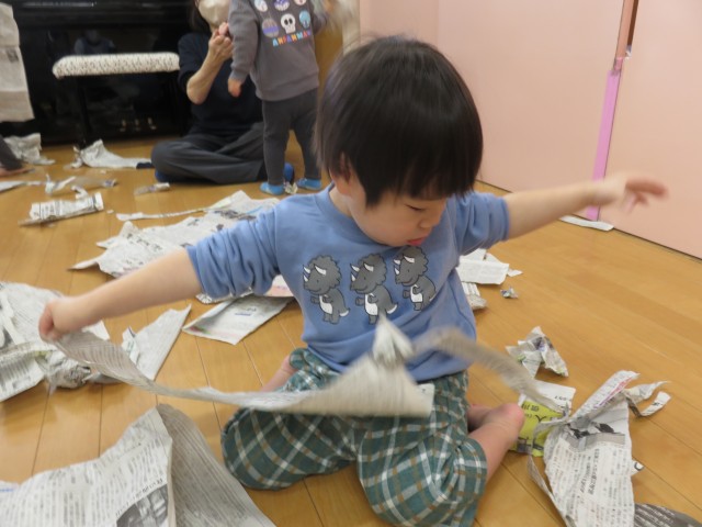 一枚の新聞紙ですが、破いたりちぎったりして指先の発達を促したり、色々なものに見立てて楽しんだり、子どもたちの発想も個性豊かに広がっていました。