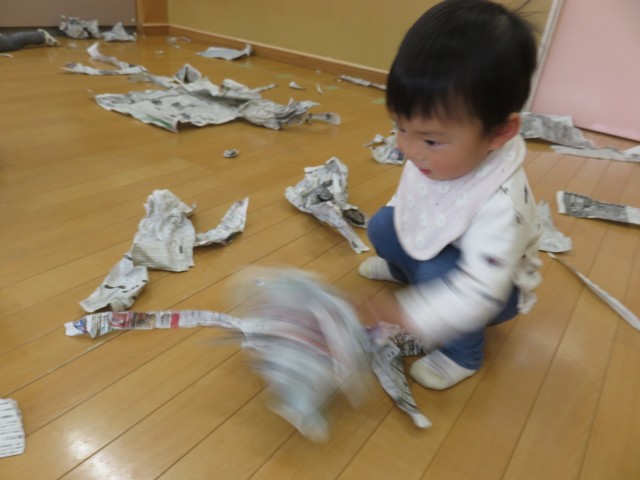 新聞遊びをしました。ビリビリに破いたり、
