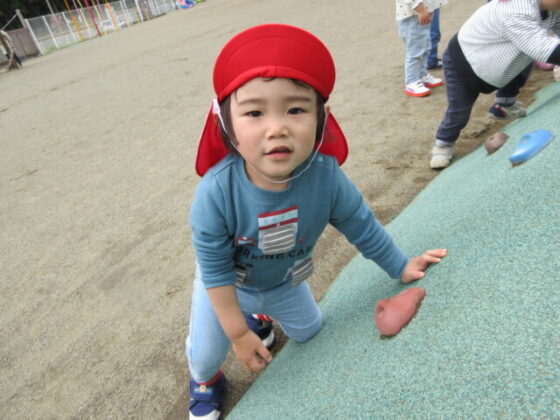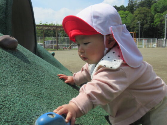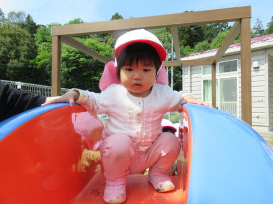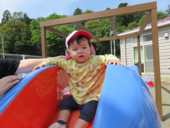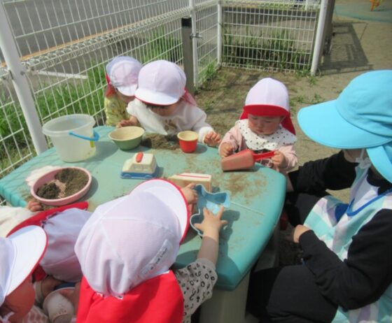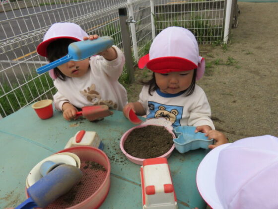 砂のお山に興味津々で、保育士と一緒に登りました。登りきるとやっほ~と保育士に手を振って喜んでいたり、いつも遊んでいる砂場にはないテーブルを見つけて、大賑わいでした。