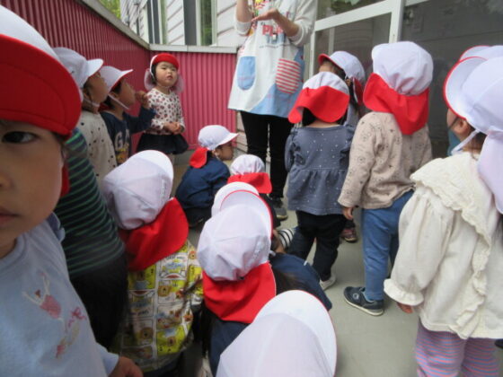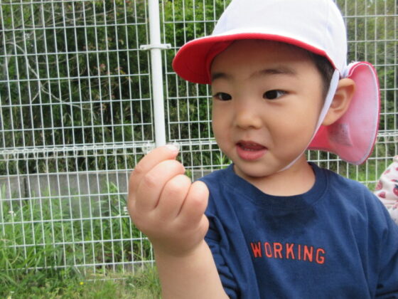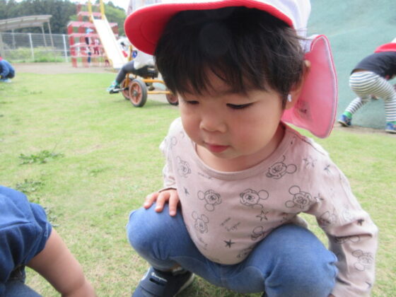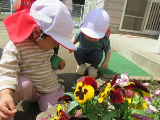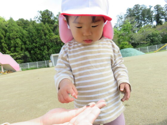 靴を履いているときに、パンジーに興味を示す子がいたので、以上児室前の花壇まで探索に行きました。パンジーを見ていると…アリやダンゴムシも見つけました。最初はじ~っと見ているだけでしたが、ちょんと触ってみる姿も見られました。